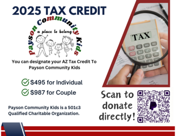 The mission of Payson Community Kids, Inc. is to promote healthy growth and development for Payson children and their families, and to encourage their positive participation in the Payson community and society in general. The program provides assistance with food, clothing, as well as opportunities for social interaction and educational activities. Services are aimed at meeting basic material needs and encouraging the development of positive self-esteem and self-responsibility.